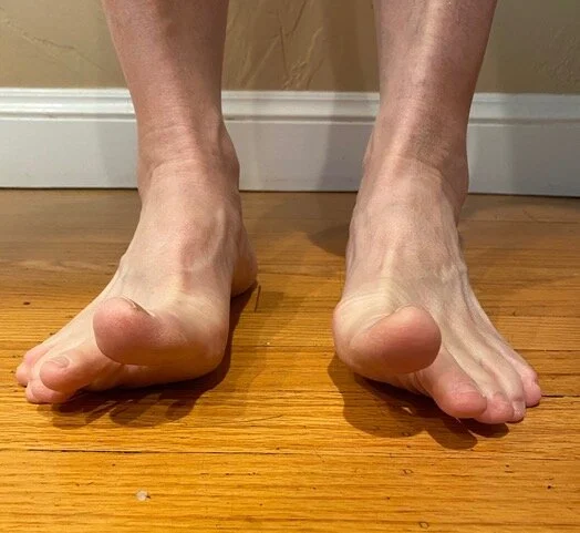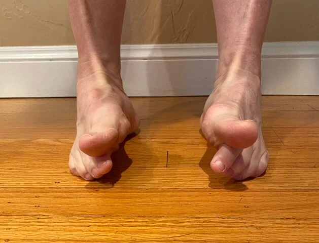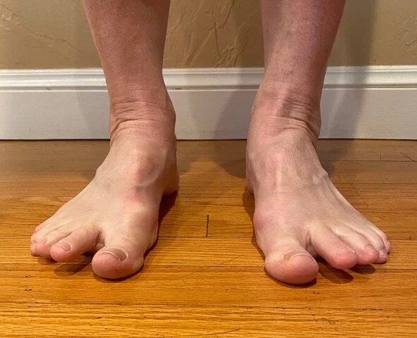 We toe out and roll through the arch of our foot with unnatural excessive pronation. This strains the Posterior Tibialis muscle. Or, the strain can be across our big toe joint which contributes to bunions.